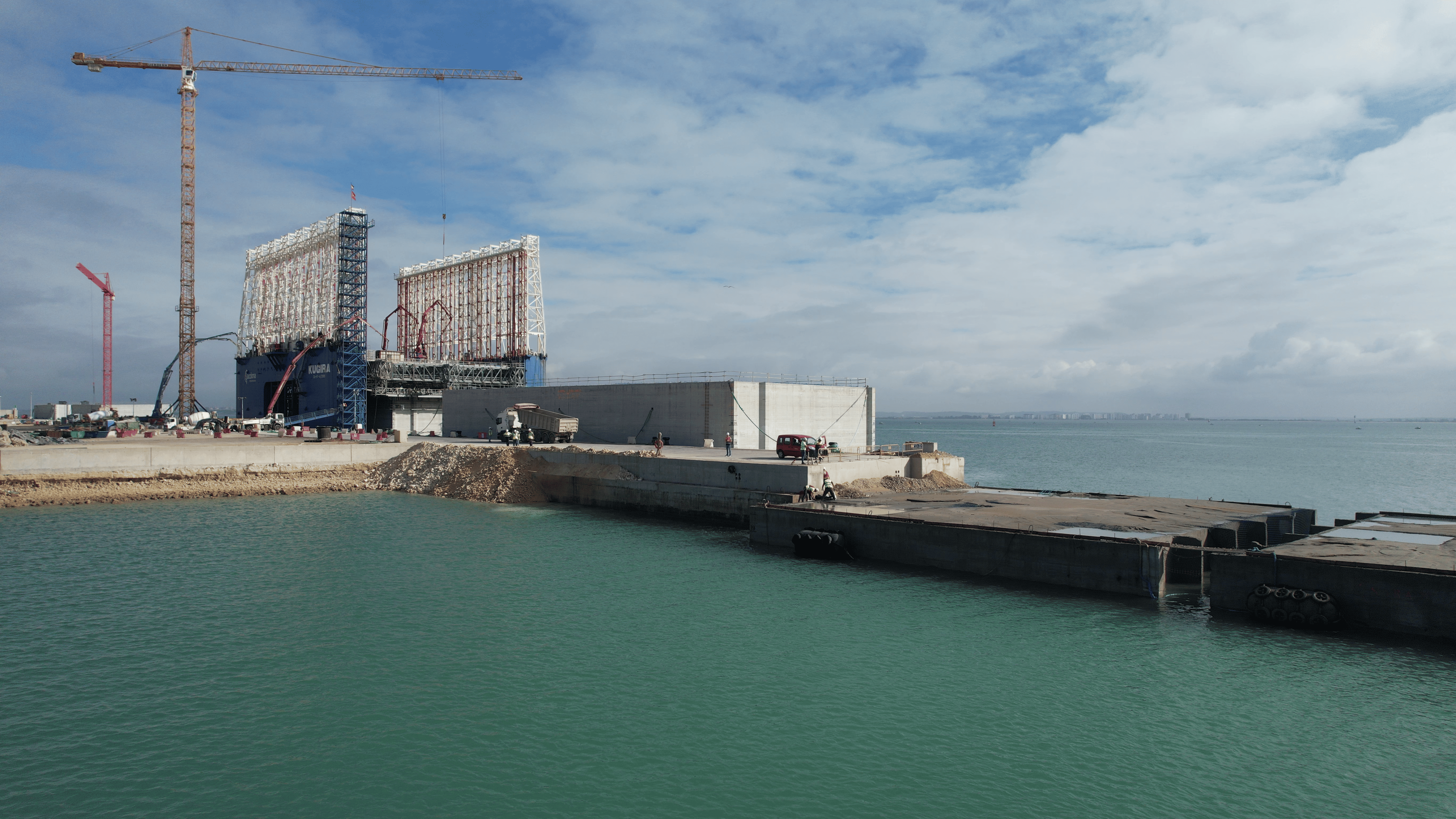 ACCIONA has achieved a significant milestone in its efforts to accelerate industrialized construction and reduce the carbon footprint of its building operations, through the design of the first fixed facility for pumping concrete to the floating Kugira quay. This development marks a new phase in port works, characterized by more integrated and efficient operations.